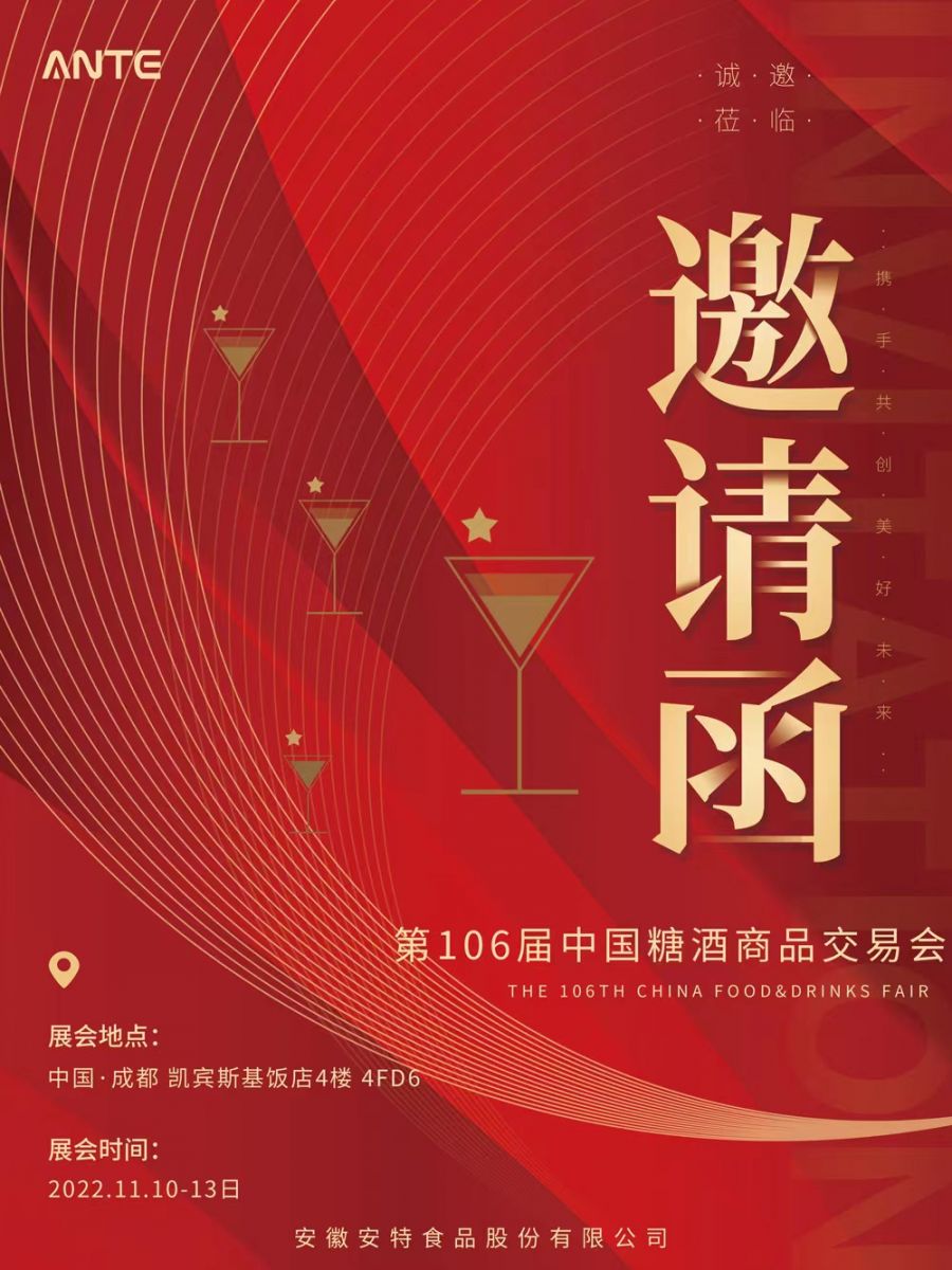 2022年11月10日-13日,第106屆全國糖酒會(huì)在成都開幕,安特?cái)y眾多產(chǎn)品精彩亮相本次大會(huì)。我們誠邀您蒞臨安特展臺(tái),共鑒美酒!