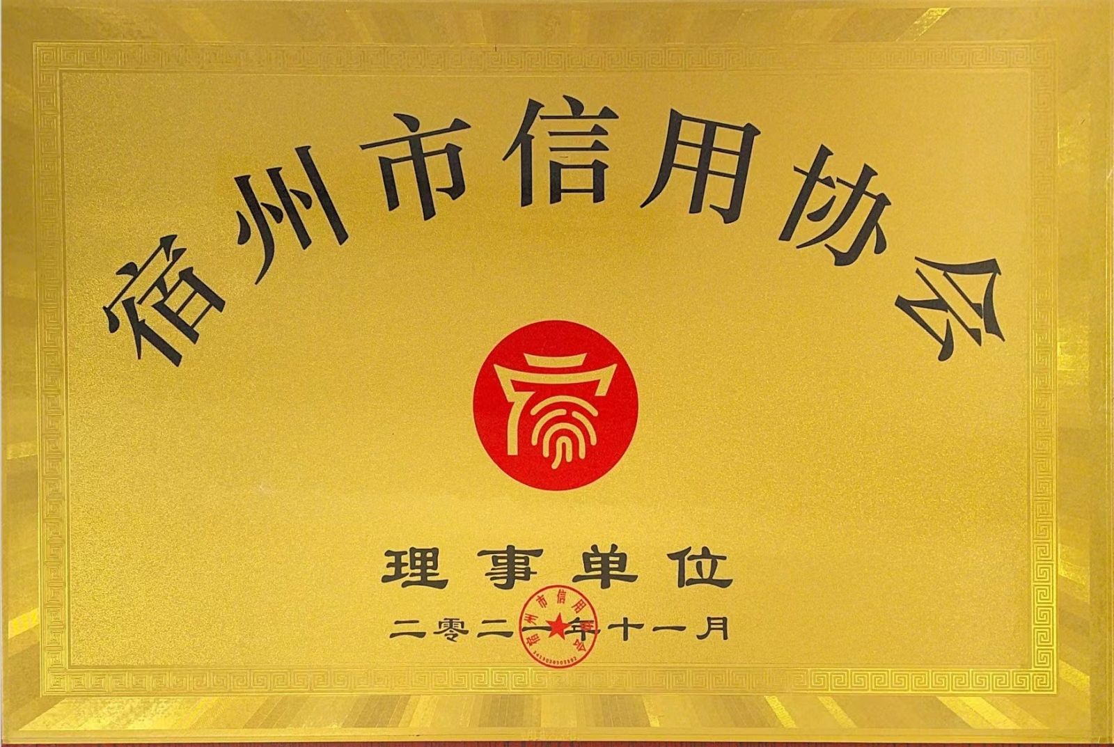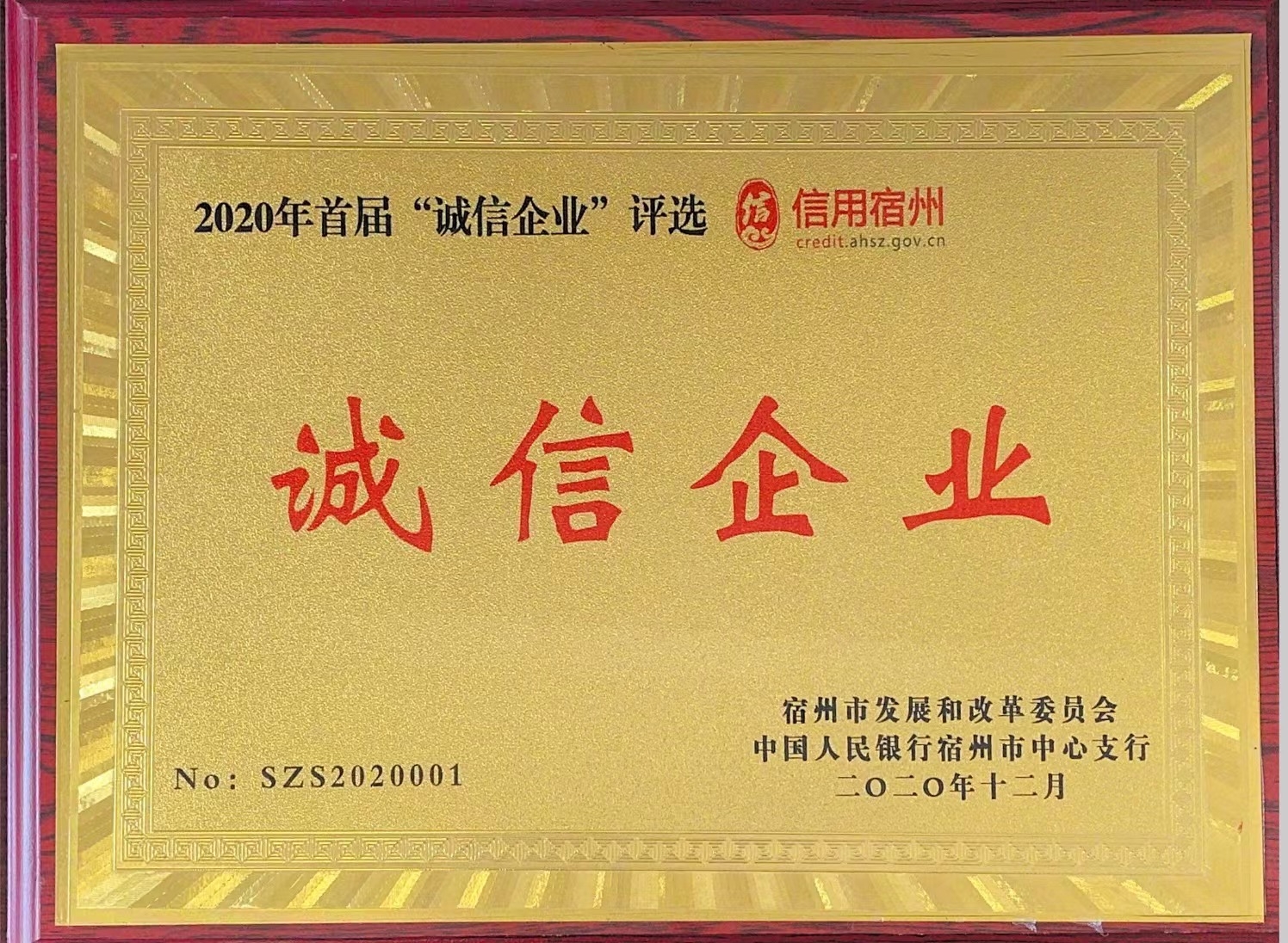 公司收到“宿州市誠(chéng)信企業(yè)”和“宿州市信用協(xié)會(huì)理事單位”榮譽(yù)獎(jiǎng)牌