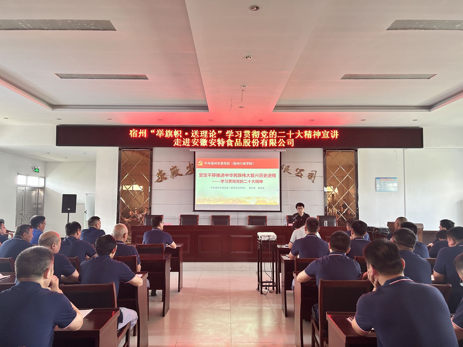 8月11日下午,宿州“舉旗幟·送理論”學(xué)習(xí)貫徹黨的二十大精神基層宣講報(bào)告會(huì)在安徽安特食品股份有限公司電教室召開。市委黨校理論研究室主任、副教授竇祥銘作專題宣講,市經(jīng)開區(qū)四級(jí)調(diào)研員、非公黨委副書記王浩主持會(huì)議。